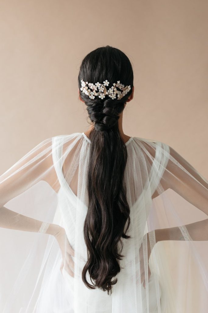 La ponytail, cioè l’acconciatura con coda di cavallo, quest’anno viene promossa e sale nella classifica di gradimento delle acconciature da sposa del 2024.