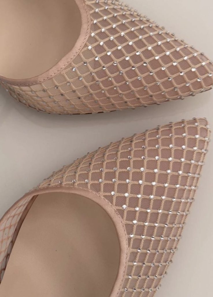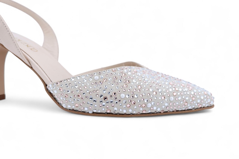 Infine, pietre e cristalli applicati aggiungono tridimensionalità e brillantezza, esaltando la scarpa senza sovrastarla.