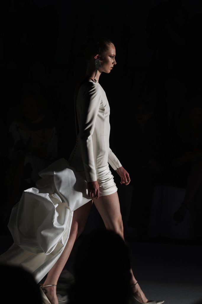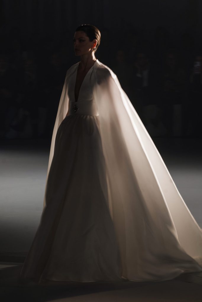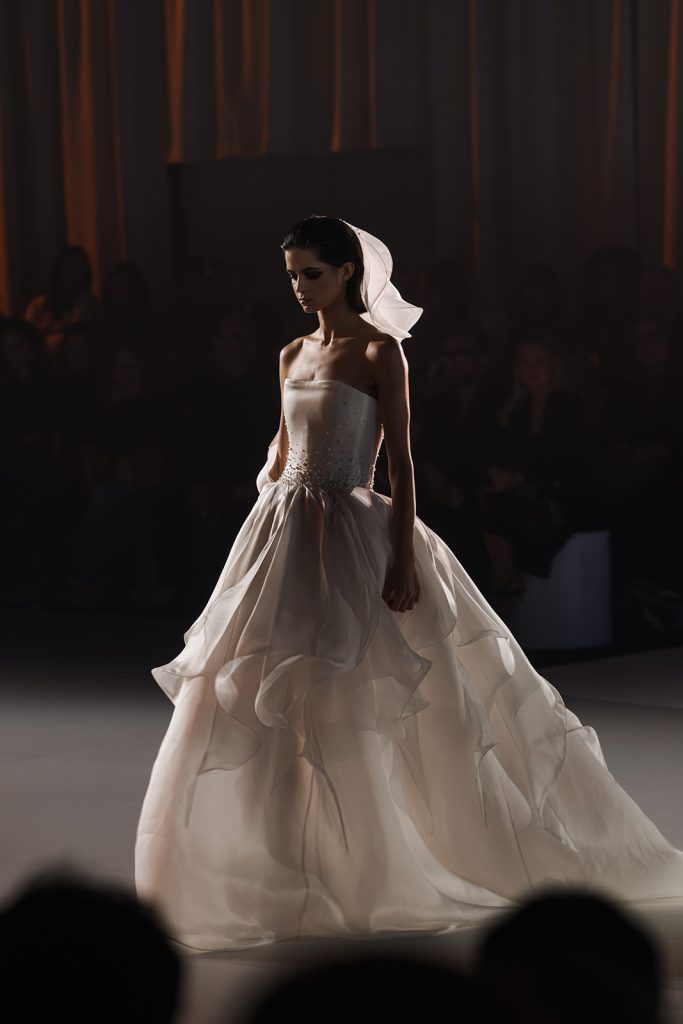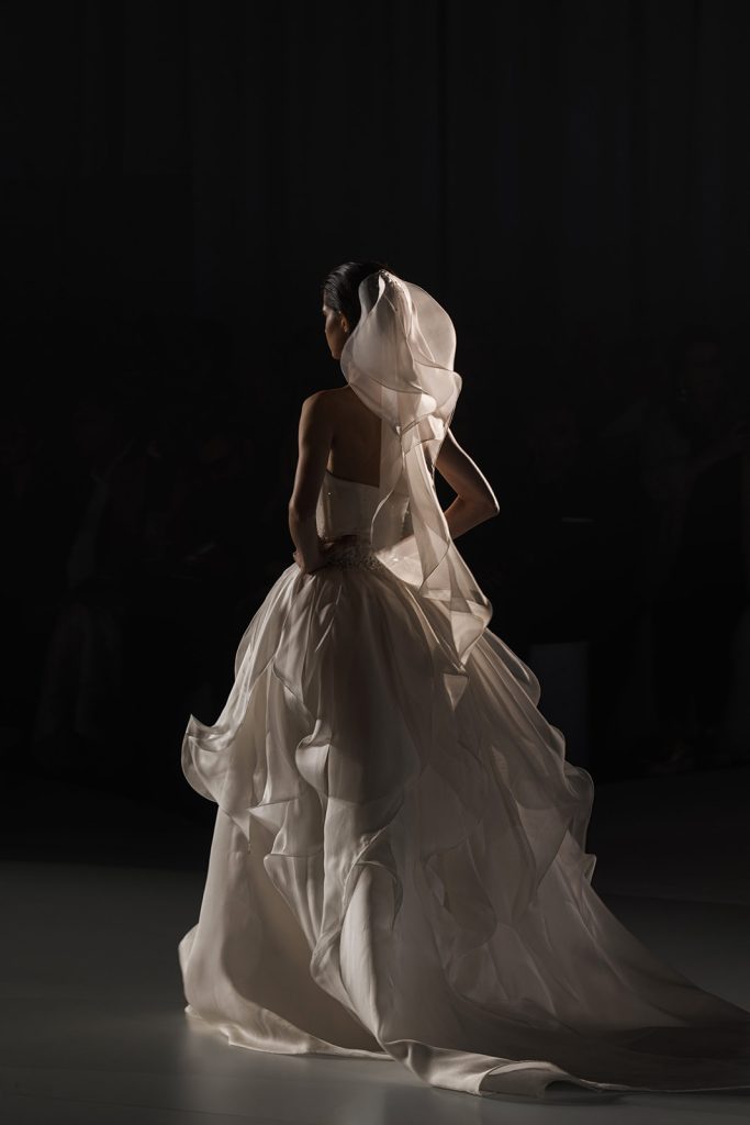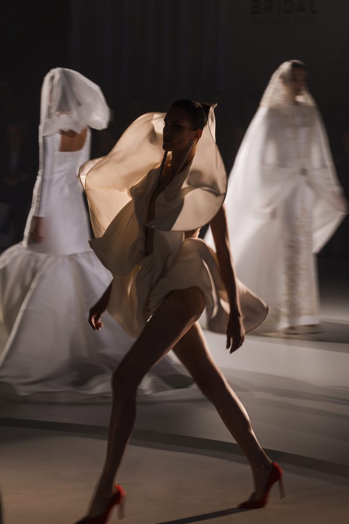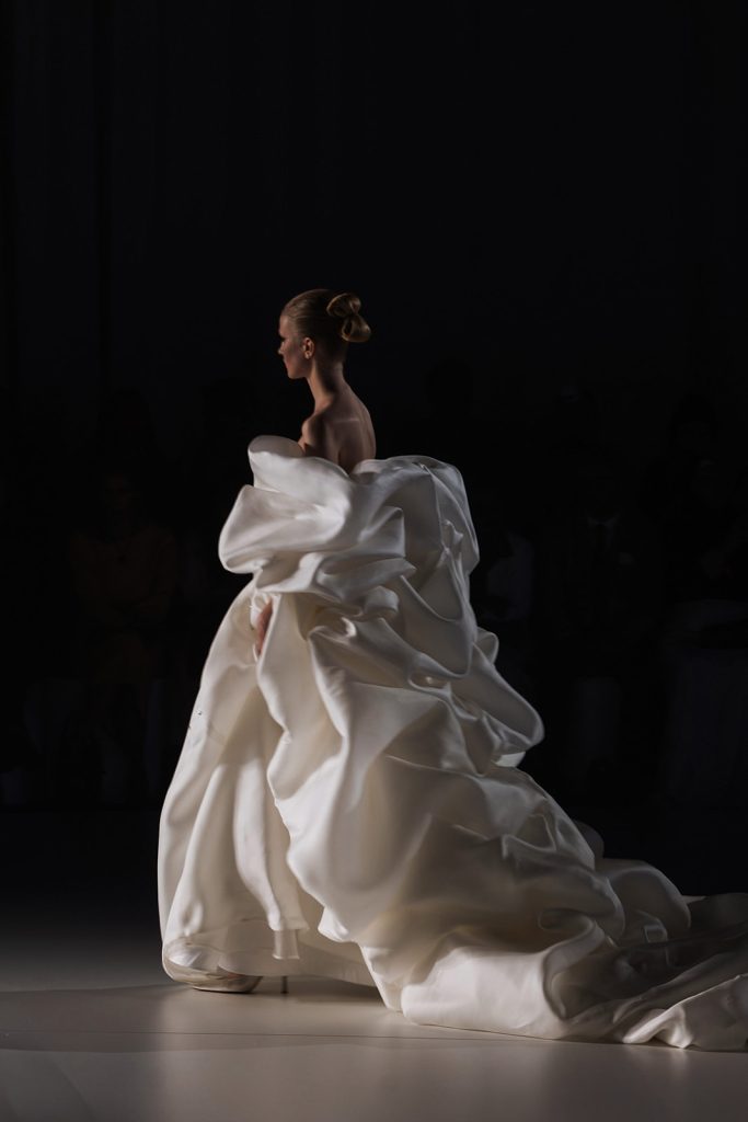 Ciò che emerge con forza è una visione precisa: il bridal come architettura applicata al corpo. Le silhouette sono costruite attraverso volumi netti e strutturati, ma allo stesso tempo capaci di aprirsi in movimenti fluidi e quasi impalpabili.