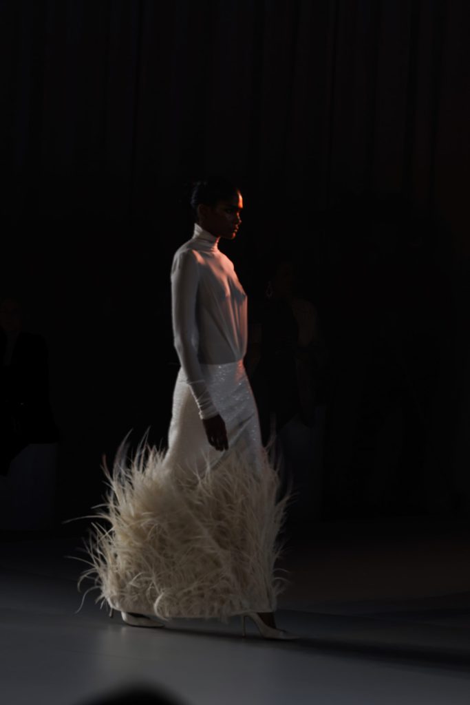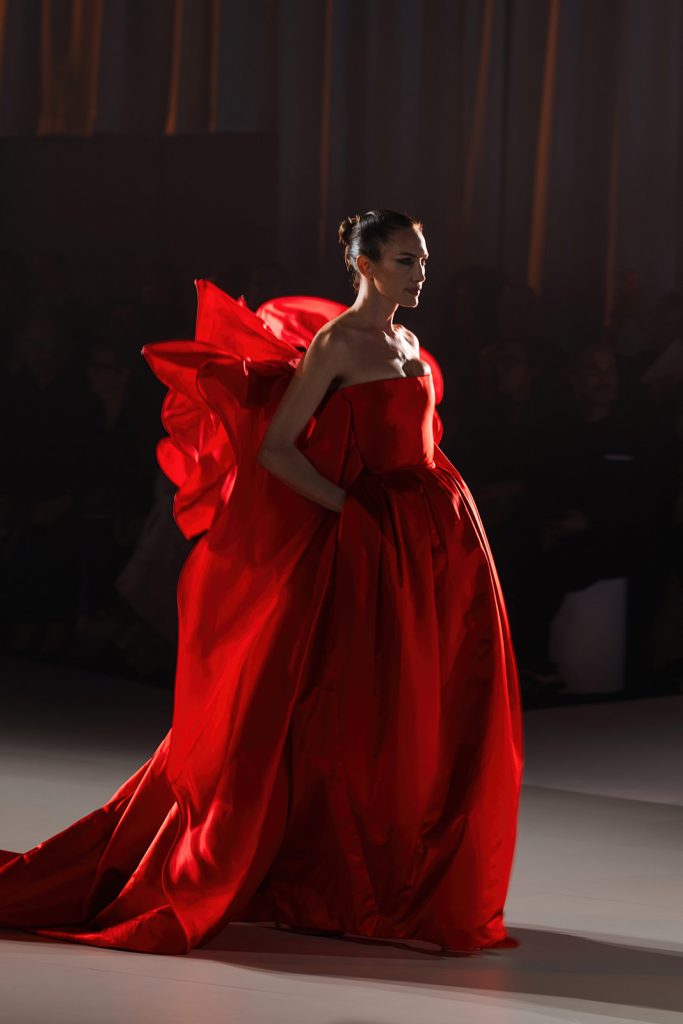 Il bianco domina la palette, declinato in texture diverse – opaco, satinato, trasparente – mentre il nero, il rosso e dettagli couture elevano i look ad una dimensione teatrale, segnando una continuità con l’estetica couture del designer.