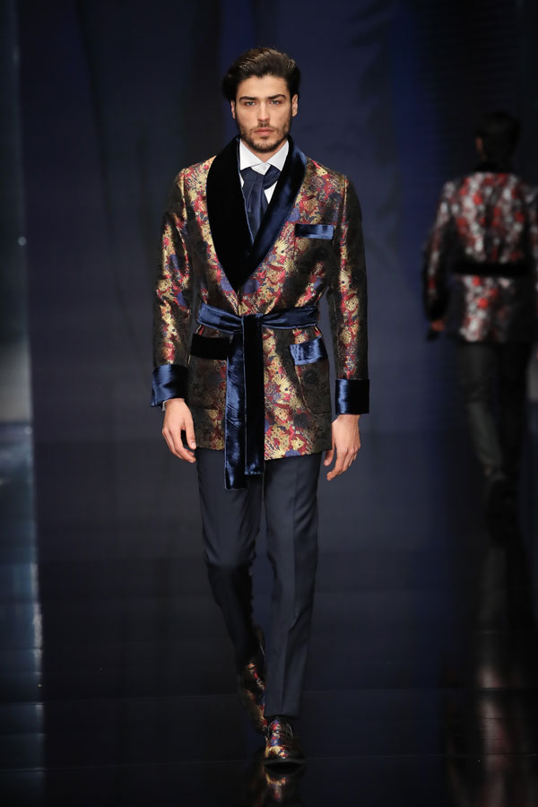 Fanno il loro debutto in collezione capi spalla che richiamano alla mente le giacche da camera; quelle più nobili, per tessuto come per stampe e colorazioni.