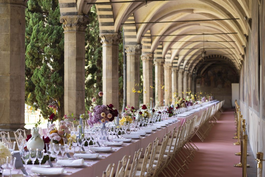 Tra affreschi storici e soffitti maestosi, i centrotavola in altezza trasformano ogni tavolo in un’opera d’arte. Eleganza e scenografia senza tempo.