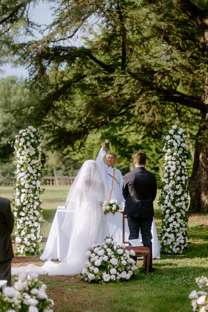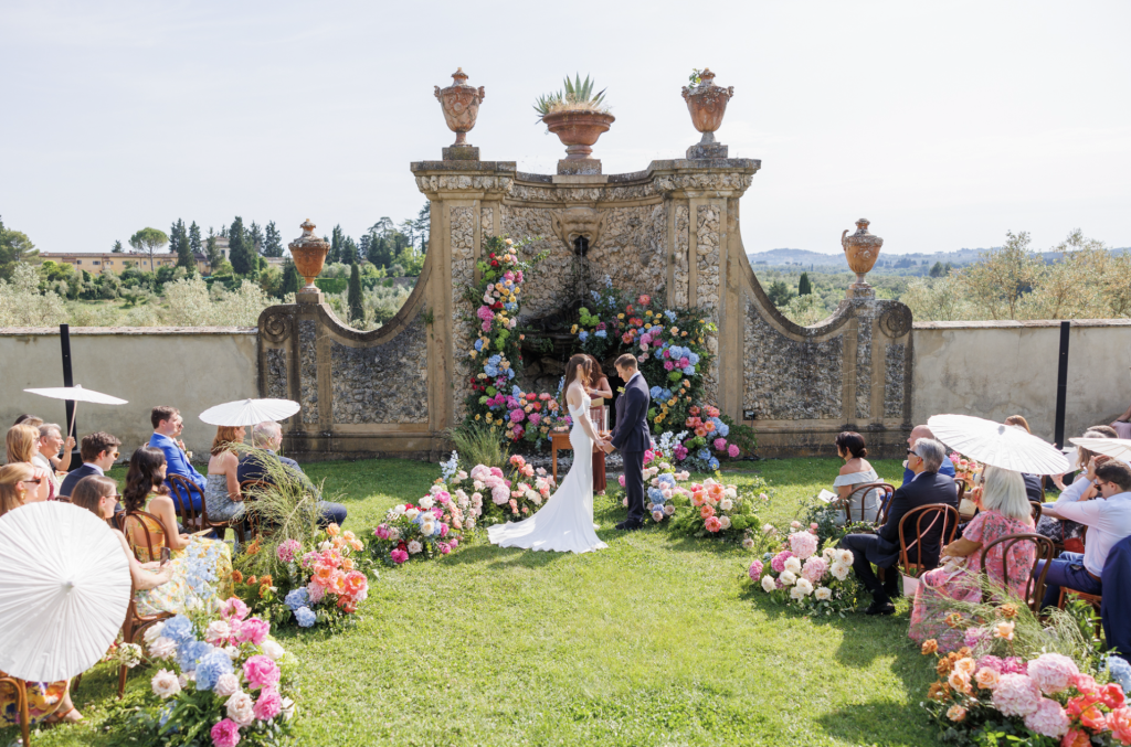 La cerimonia all’aperto ha un fascino profondamente emozionale: il paesaggio diventa scenografia e la luce naturale disegna i volumi.