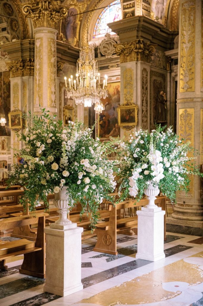 Da un lato troviamo composizioni scenografiche dall’effetto “Wow” immediato con tanti, tantissimi fiori che accompagnano la sposa nel suo ingresso.