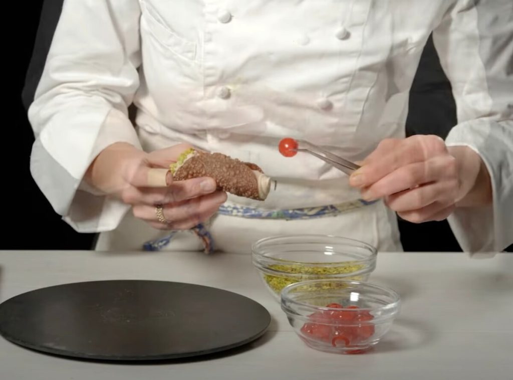 Accanto ai grandi classici compaiono monoporzioni eleganti: mini cassate destrutturate, cannoli scomposti, mousse alla ricotta con agrumi di Sicilia, tartellette con crema di pistacchio e sale marino.
