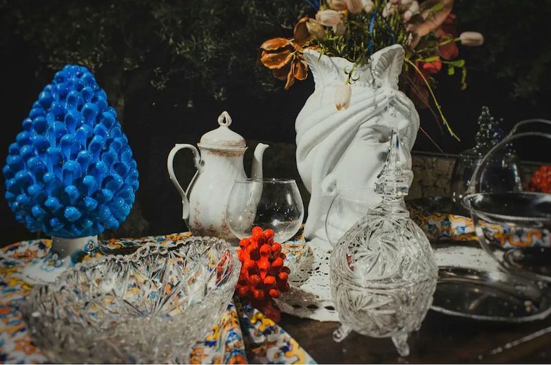 L’allestimento richiama l’immaginario siciliano attraverso elementi iconici: ceramiche artigianali, agrumi, fichi d’India, maioliche e dettagli barocchi.