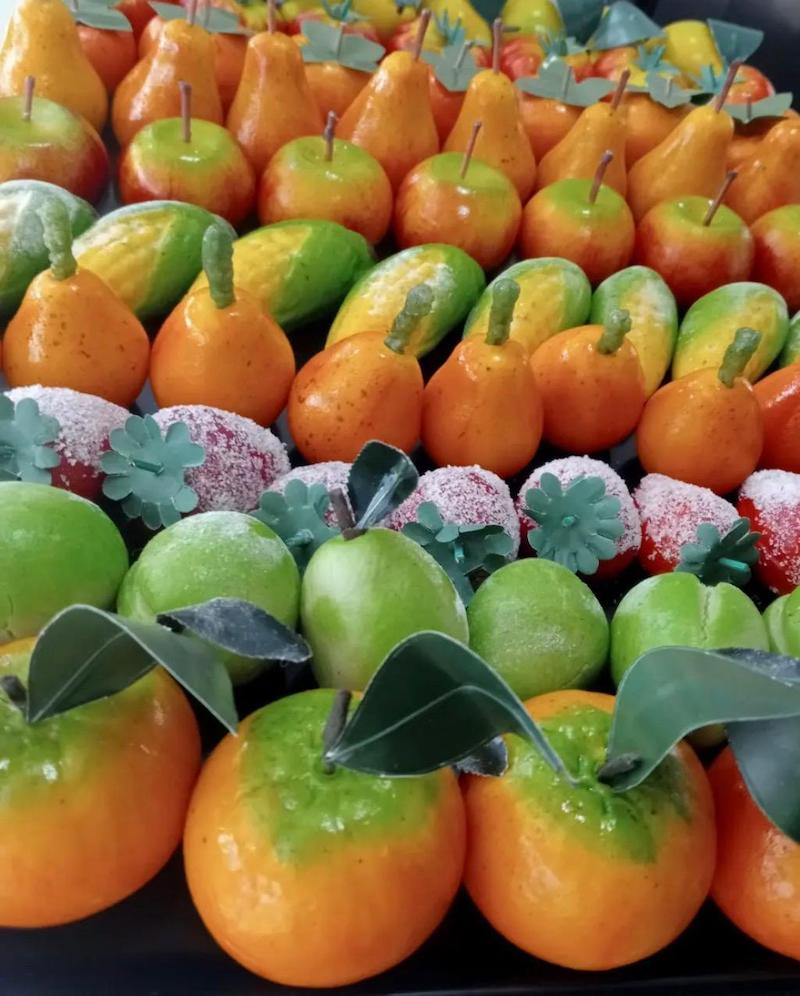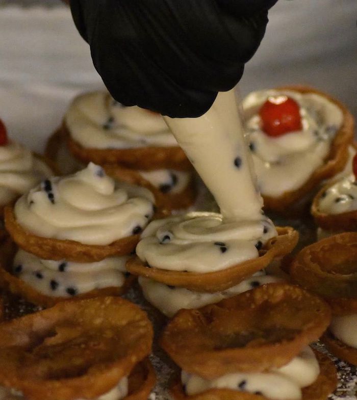 In questo caso il buffet si sviluppa come una pasticceria tradizionale “dal vivo”: cannoli riempiti al momento con ricotta fresca, cassata siciliana decorata, paste di mandorla, frutta martorana e piccoli assaggi di torroni e dolci alle spezie.