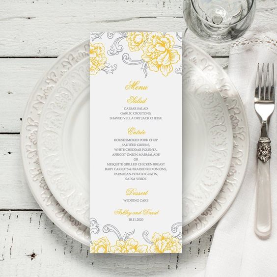 Coordinato è la parola d’ordine per i matrimoni di oggi. Così, anche il menù di nozze da riporre sul piatto di ogni ospite al tuo matrimonio o al centro di ogni tavolo della location si deve tingere della stessa fantasia e degli stessi colori delle partecipazioni e di tutti gli elementi di carta.