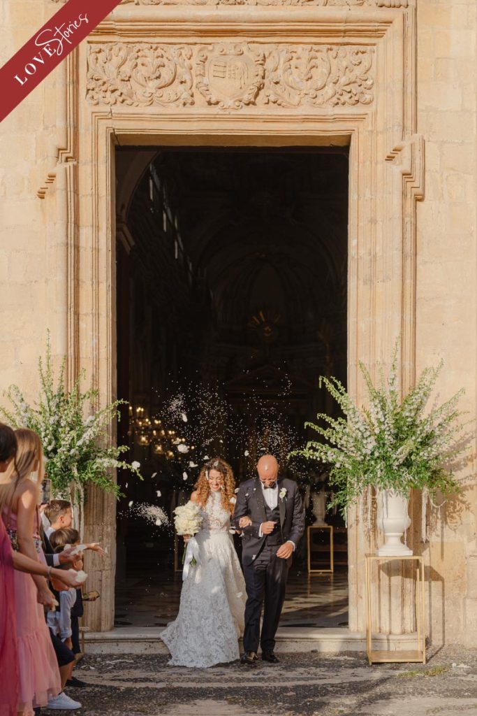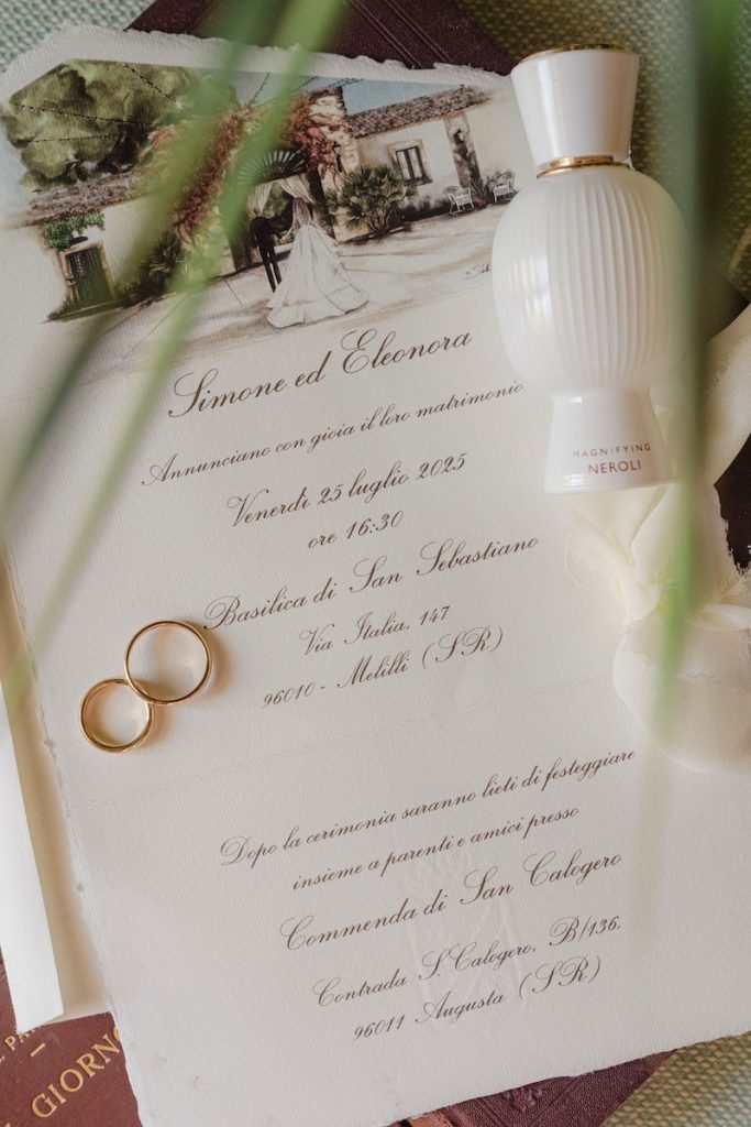 Eleganza e romanticismo sussurrati hanno toccato ogni elemento. Dagli inviti, decorati con un acquerello a rappresentare gli sposi che entrano, mano nella mano, nella Commenda di San Calogero.