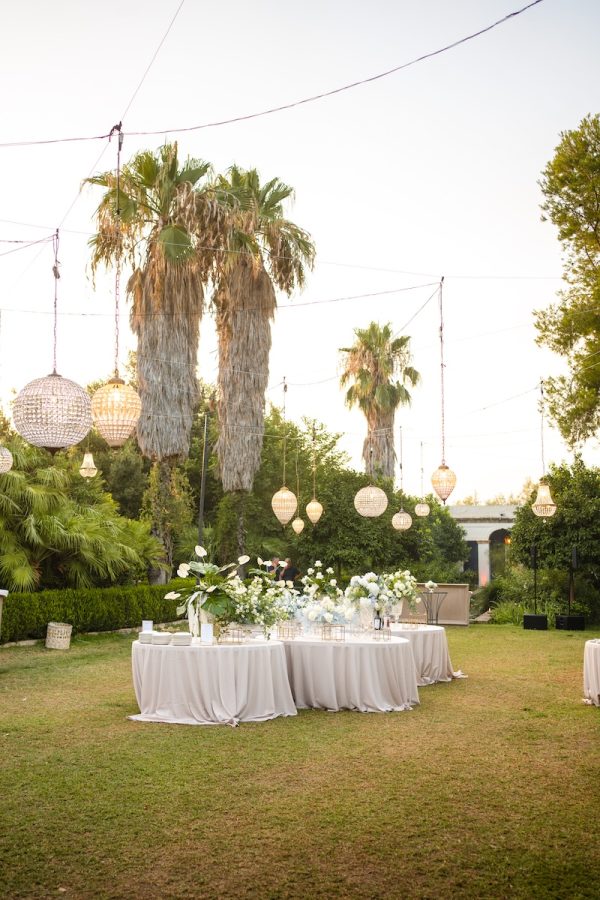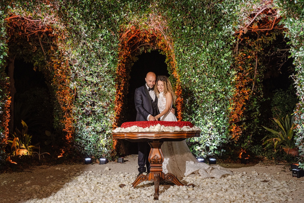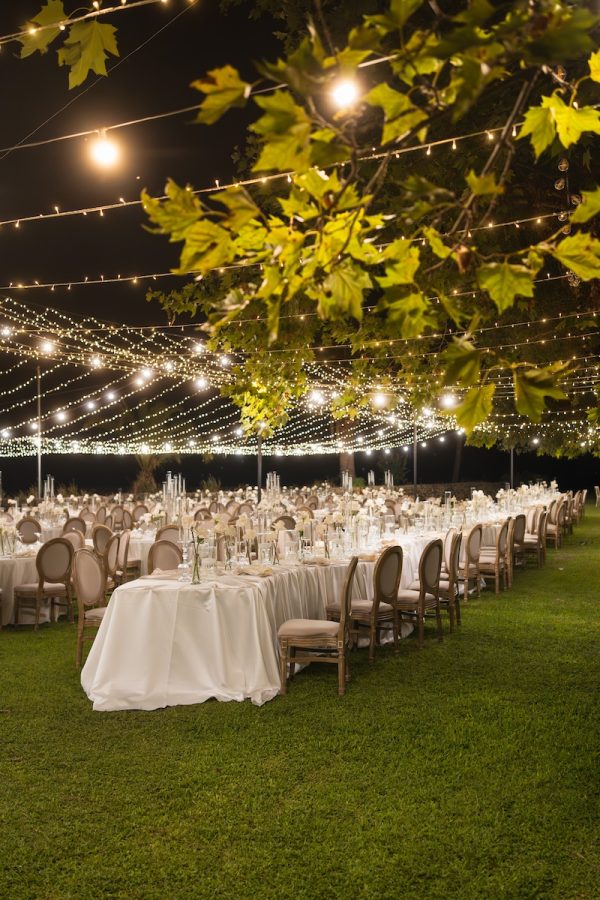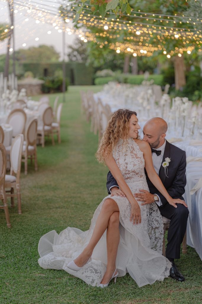 “Immerso nella natura, il design del ricevimento è stato studiato con cura per conferire all’ambiente un aspetto armonioso e arioso”, raccontano Luca Melilli e Franco Cannata di Panta Rhei Wedding.