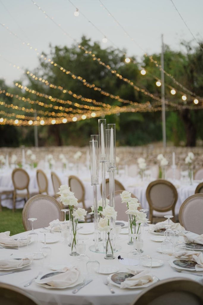 Lampadari di cristalli, sedie color tortora chiaro, candele galleggianti, rose bianche e lineari, disposte su altezze diverse all’interno di vasi cilindrici trasparenti: il décor ha seguito un mood da fiaba romantica e contemporanea.
