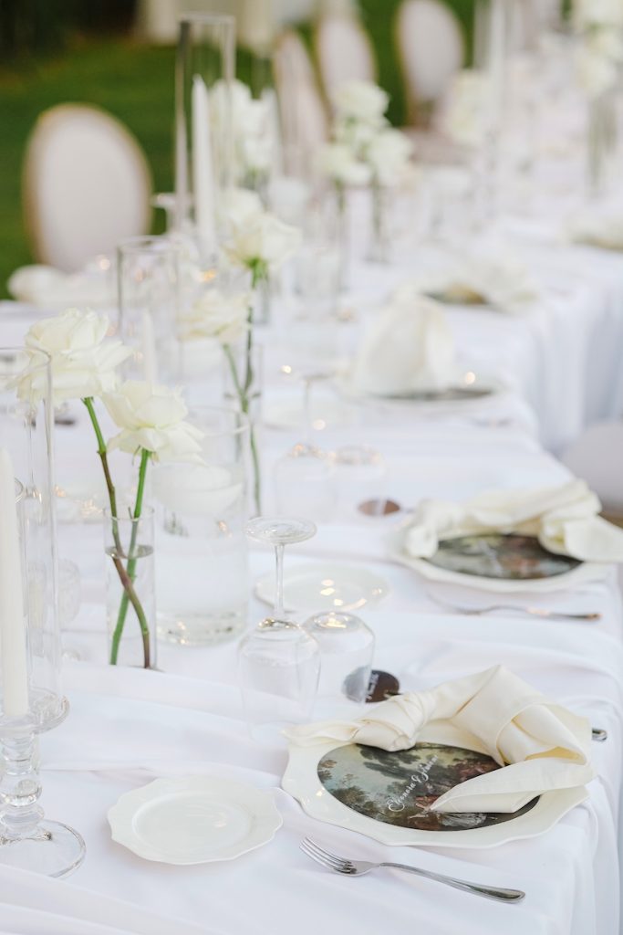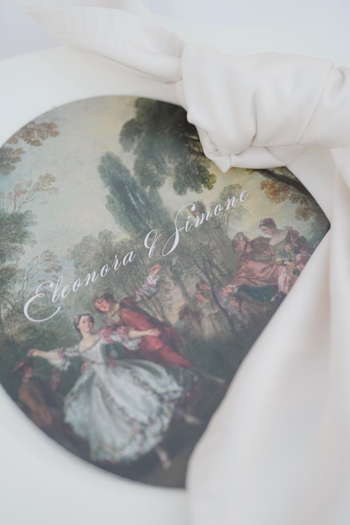 A caratterizzare la mise en place un’estetica pulita sviluppata attraverso tovaglioli bianchissimi ed elegantemente annodati e segnatavoli con stampa rococò ispirata a Fragonard.