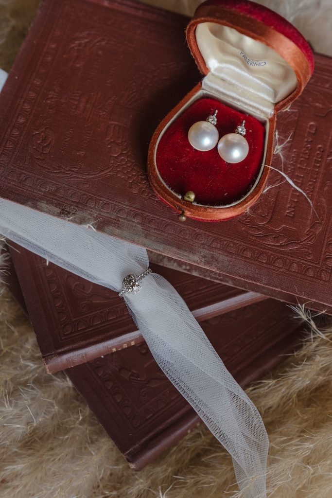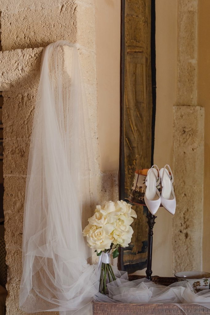 Agli accessori della sposa, preziosi e minimali. E poi focus sul bouquet di rose: bianchissime e lavorate a mano.