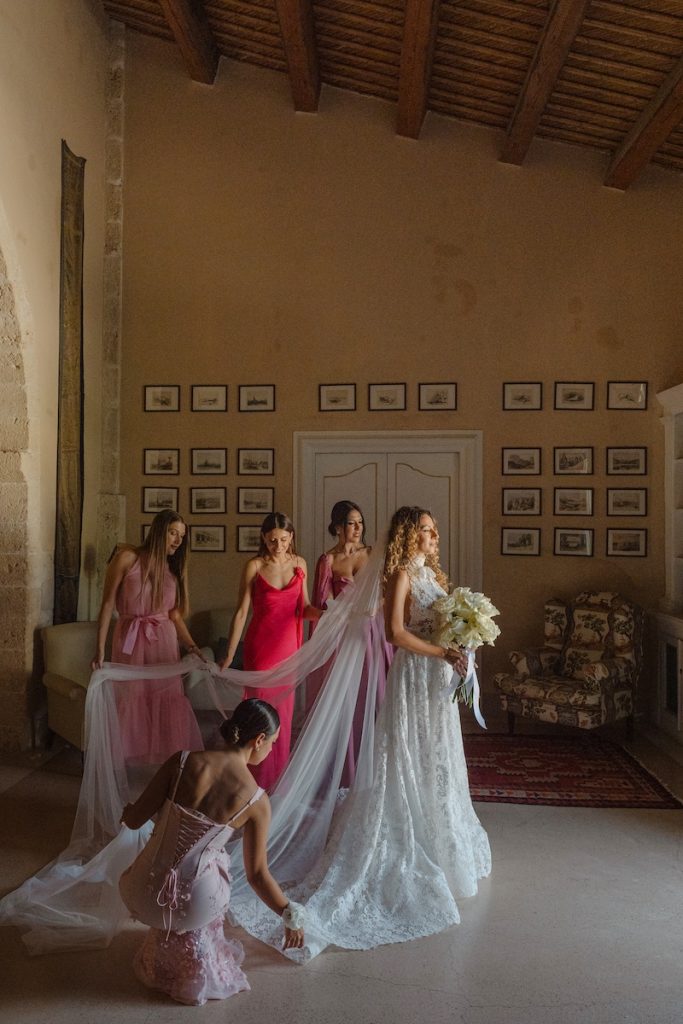 Al fianco della sposa, le sue damigelle tutte in gradazioni di rosa.