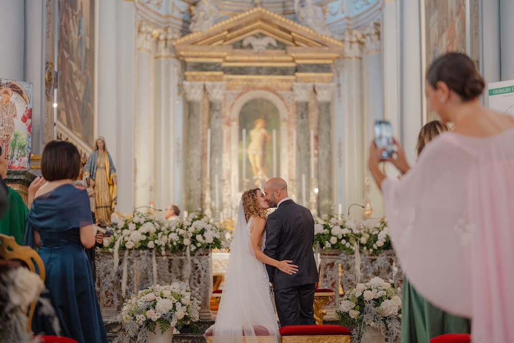 Un morbido abbraccio floreale ha accolto lo scambio delle promesse: fin dal Sì, il grande giorno di questi due sposi si è distinto per grazia e ricercatezza.