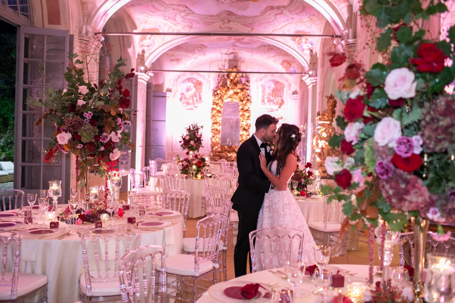 Un matrimonio elegante, con il borgogna a fare da filo conduttore, è quello che ha preso vita nella suggestiva Villa Faraggiana.