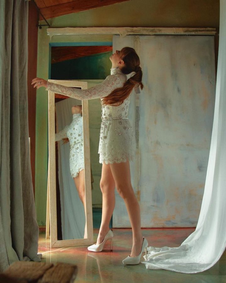 La cantante, certamente “Bellissima”, ha condiviso solo due scatti in abito da sposa: un cortissimo mini dress Dolce&Gabbana.