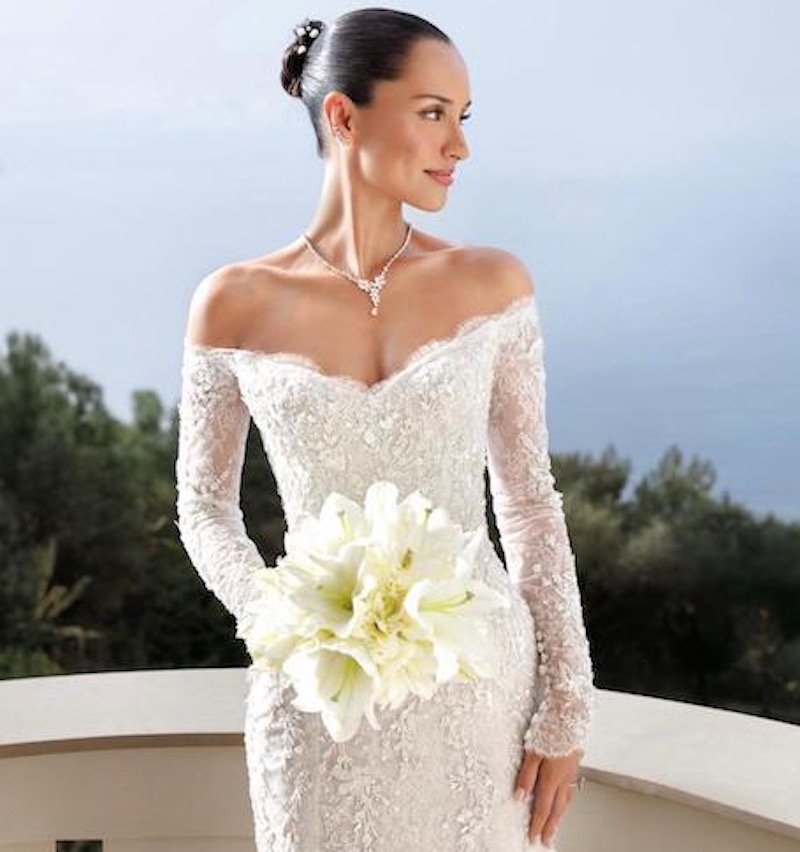 Il modello, in delicato pizzo, accarezzava la silhouette con una linea a sirena e un elegante scollo a cuore off-the-shoulder, completato da un sinuoso strascico. A impreziosire la creazione, ricami luminosi di cristalli e paillettes che catturavano la luce con discreta eleganza.