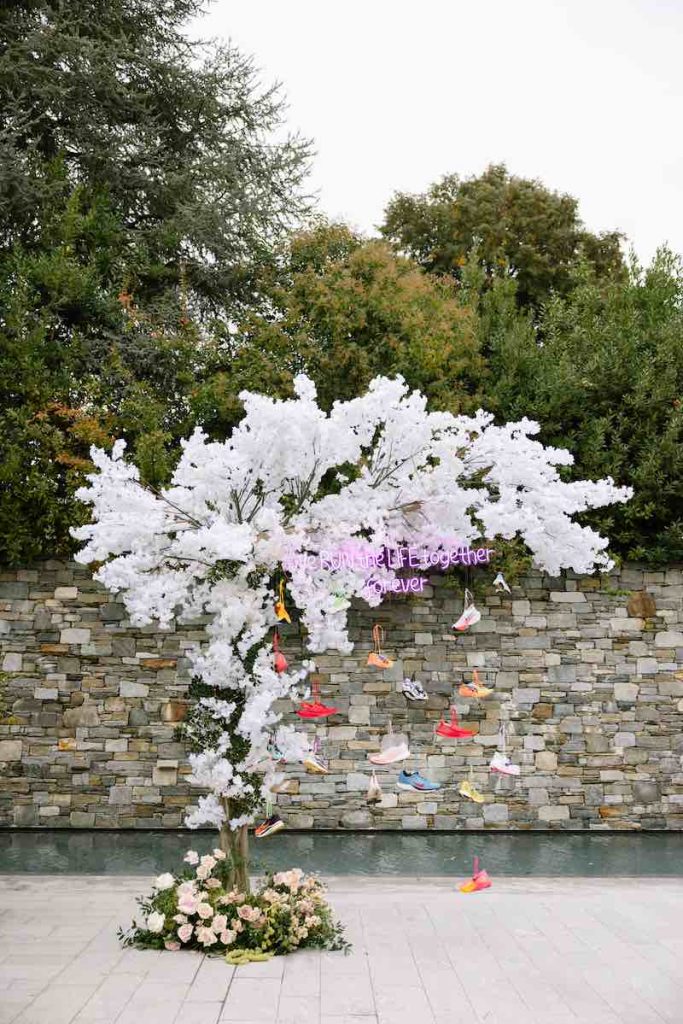Tra gli elementi più scenografici dell’allestimento c’è stato sicuramente il Photobooth, ideato per raccontare l’anima sportiva della coppia: una cascata di scarpe da corsa e una luminosa scritta con il gioco di parole “We RUN the LIFE together forever” ha reso il décor del ricevimento davvero unico nel suo genere, un tributo alla loro passione condivisa per la corsa e alla loro vita insieme.