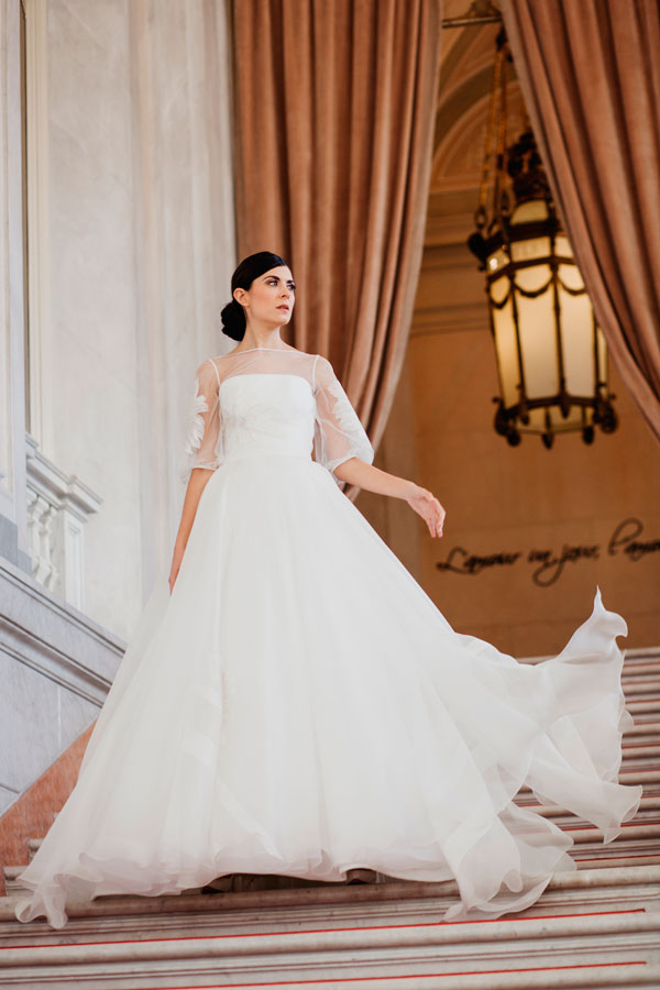 La collezione di abiti da sposa Couture Hayez è romantica, con leggeri e delicati abiti da principessa, realizzati con tessuti preziosi, come il pizzo chantilly e le morbide organze