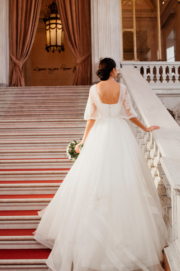 Il romanticismo è una delle caratteristiche principali degli abiti da sposa Couture Hayez. Sono i dettagli a mostrare il lato dolce e raffinato dei vestiti, come i fiocchi dalle dimensioni modeste posti sul retro dell’abito, e i ricami in pizzo dall’effetto floreale.