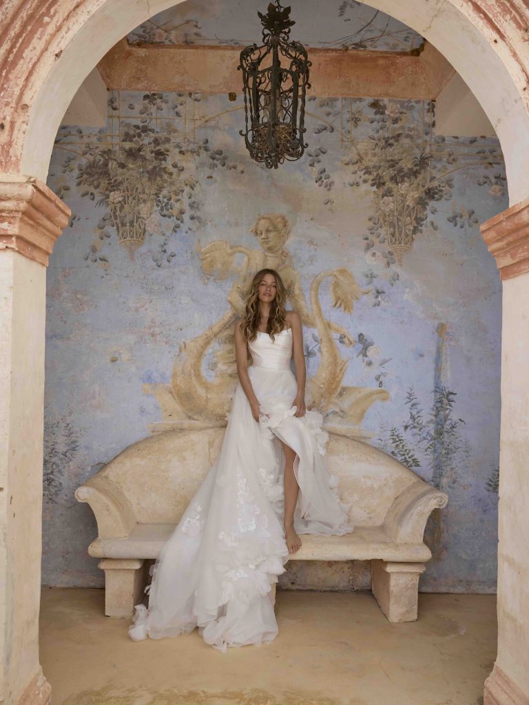 Modelli disegnati pensando ad una principessa moderna che vuole mostrare tutta la sua dolcezza ma che, al tempo stesso, sa cosa vuole e lo dimostra con le trasparenze sensuali, gli spacchi profondi e le scollature audaci.