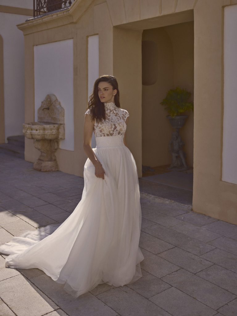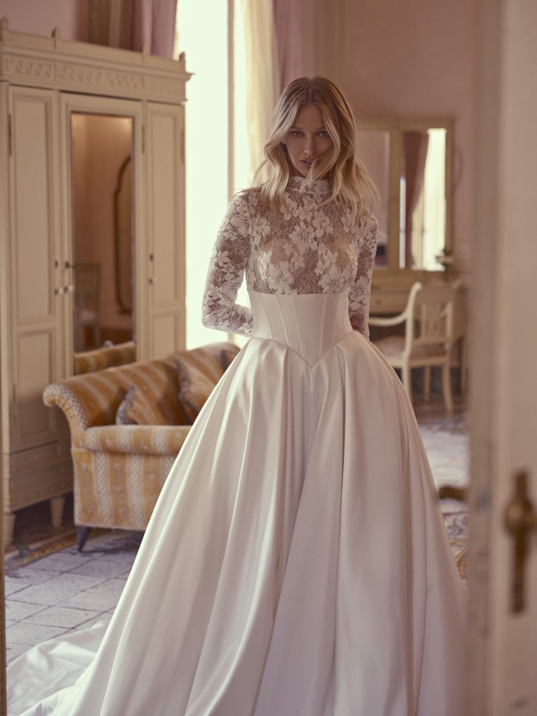 Per le spose che non vogliono rinunciare al romanticismo assoluto, gli abiti interamente realizzati in pizzo sono una dichiarazione d’amore senza tempo. Chantilly, guipure o rebrodé: ogni tipologia di pizzo regala texture diverse, capaci di trasformare l’abito in una piccola opera d’arte.
