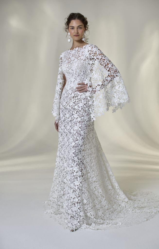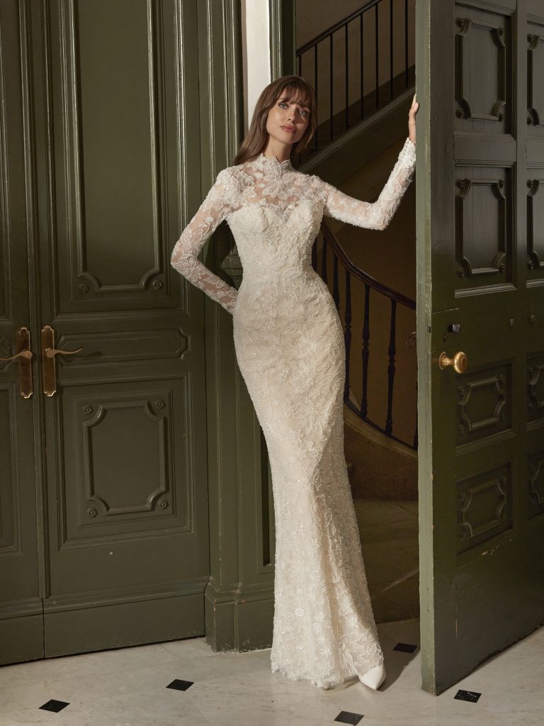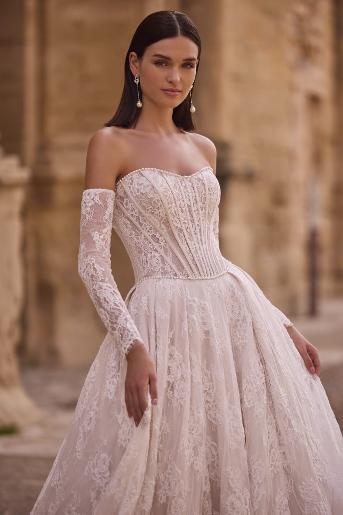 Tra le tendenze più forti degli abiti da sposa in pizzo 2026 ci sono senza dubbio le maniche. Che siano lunghe e sottili, con il celebre effetto tattoo, o ampie e lavorate, donano un’allure sofisticata e romantica.
