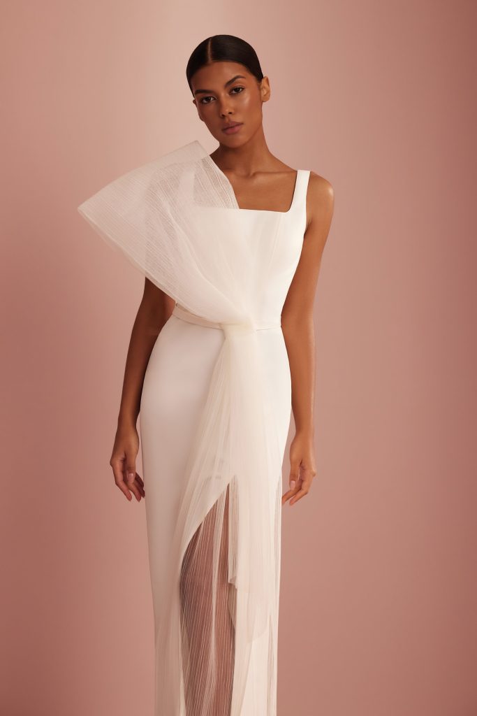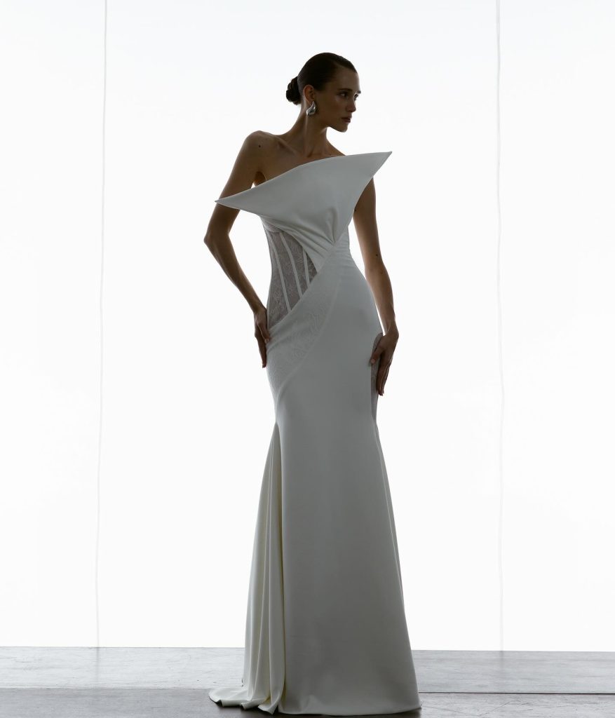 La ricerca su geometrie e volumi rende gli abiti da sposa vere opere sartoriali d’avanguardia, capaci di valorizzare il corpo con eleganza e rigore.