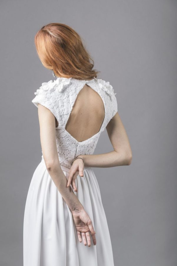 Abito componibile formato da un tubino bianco e un vestito di pizzo svasato sopra della collezione abiti da sposa More 2018 Plumeria – Photo Credits: IRIDE Work in Pixel – Luca Savettiere
