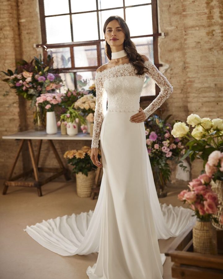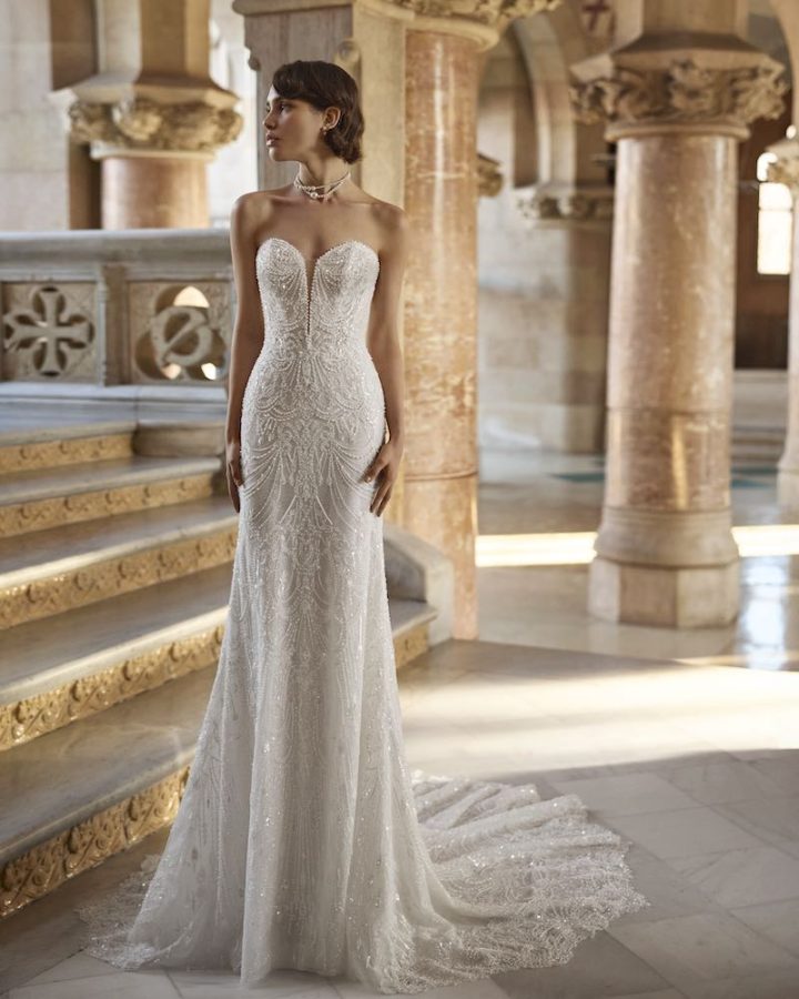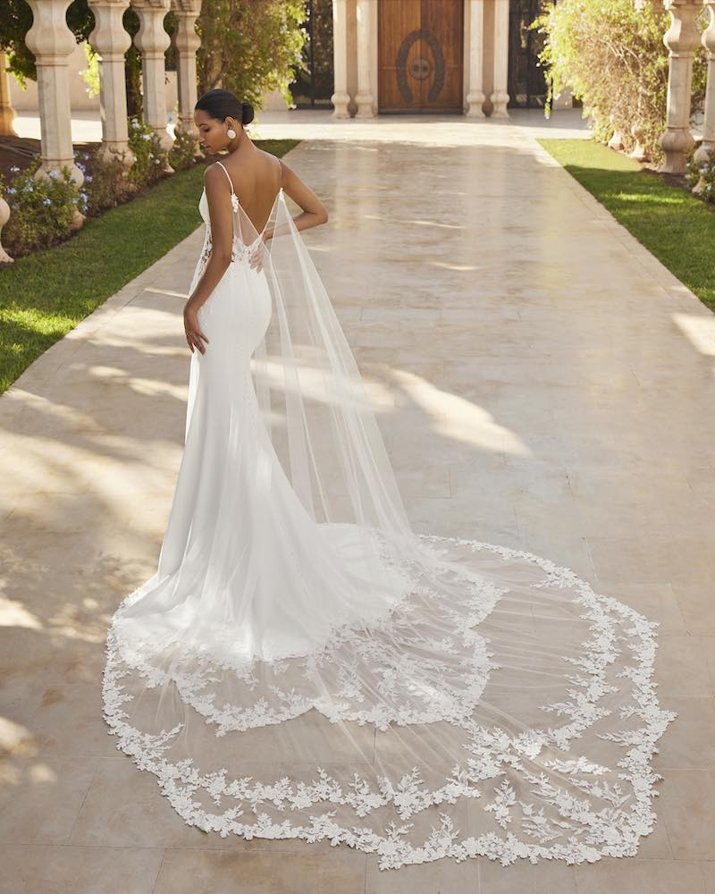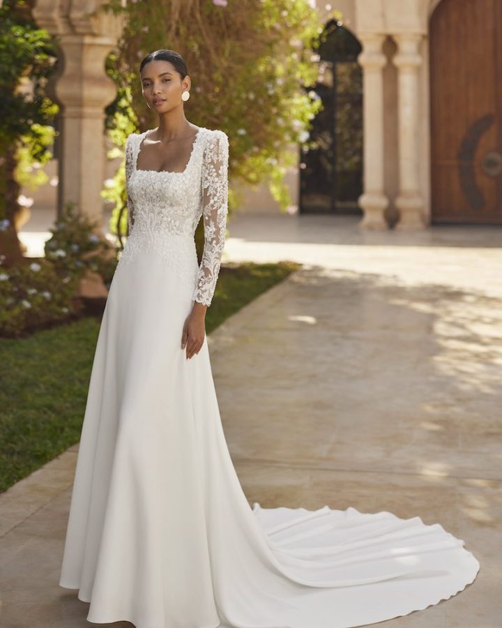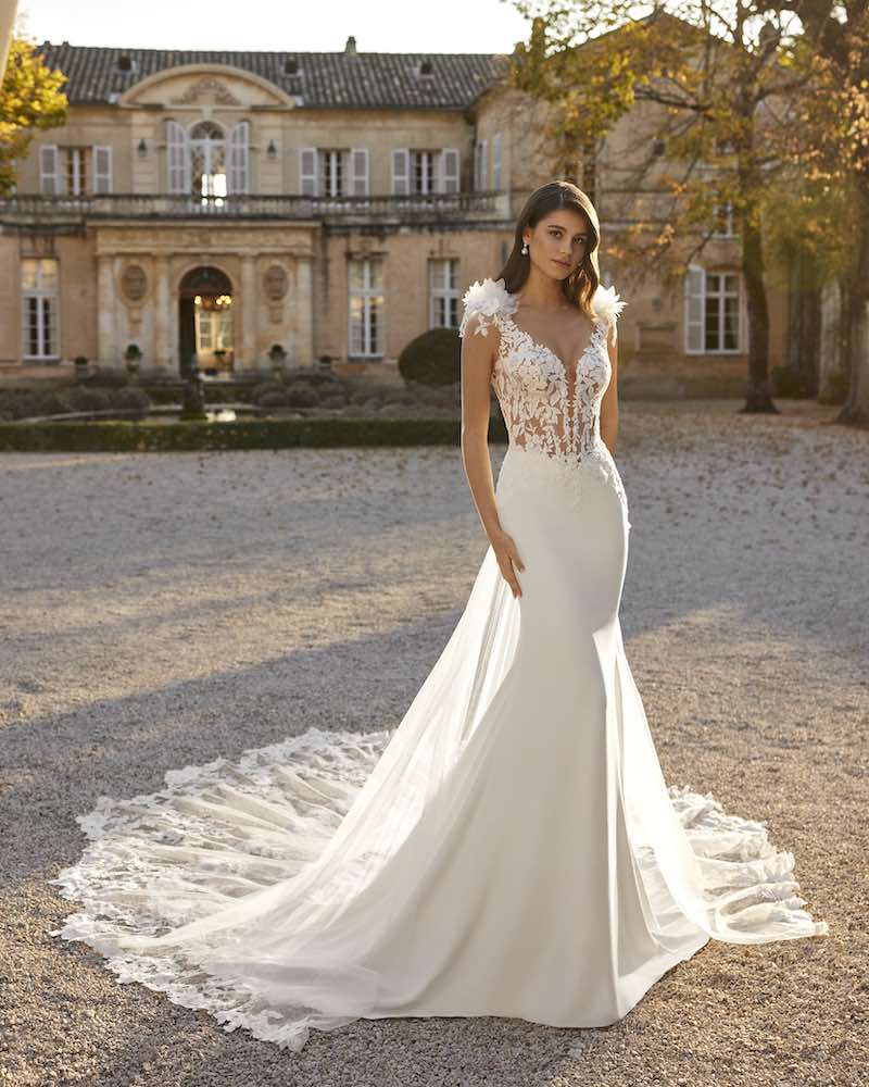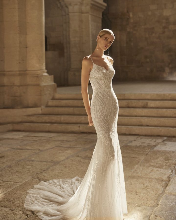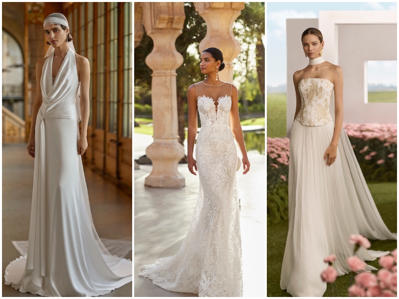 Le silhouette a sirena o principessa si distinguono per schiene effetto nudo, scollature quadrate o all’americana e la possibilità di personalizzare il look con giacche in pizzo, veli fantasia o sopragonne eteree in tulle.