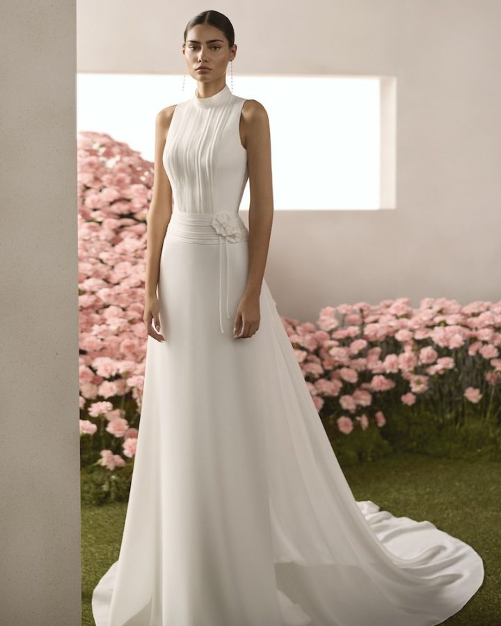 Novità assoluta, i modelli rosa tenue decorati da fiori 3D su scollo e vita, che introducono un tocco di colore delicato e poetico nel mondo Bridal.