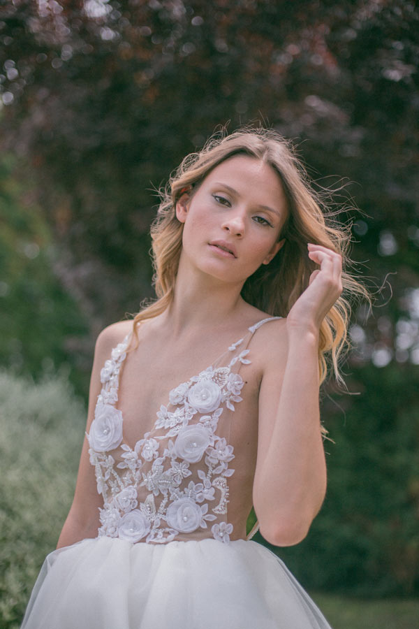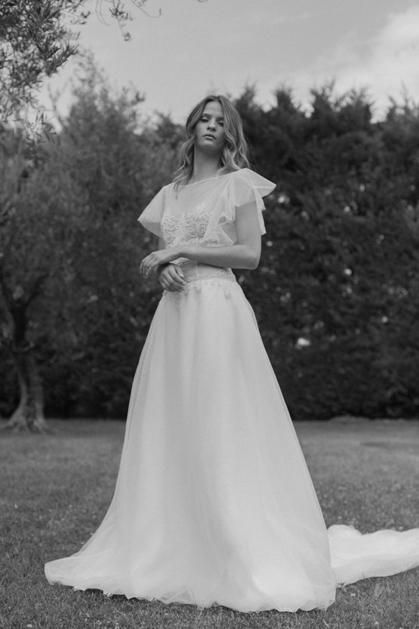 Destrutturati e leggeri, i vestiti sono arricchiti da balze in pizzo che donano movimento. In seta, tulle e chiffon, gli abiti accarezzano con dolcezza le forme della sposa e sono impreziositi da dettagli brillanti, perle, perline, cristalli e decorazioni in 3D, come i fiori.
