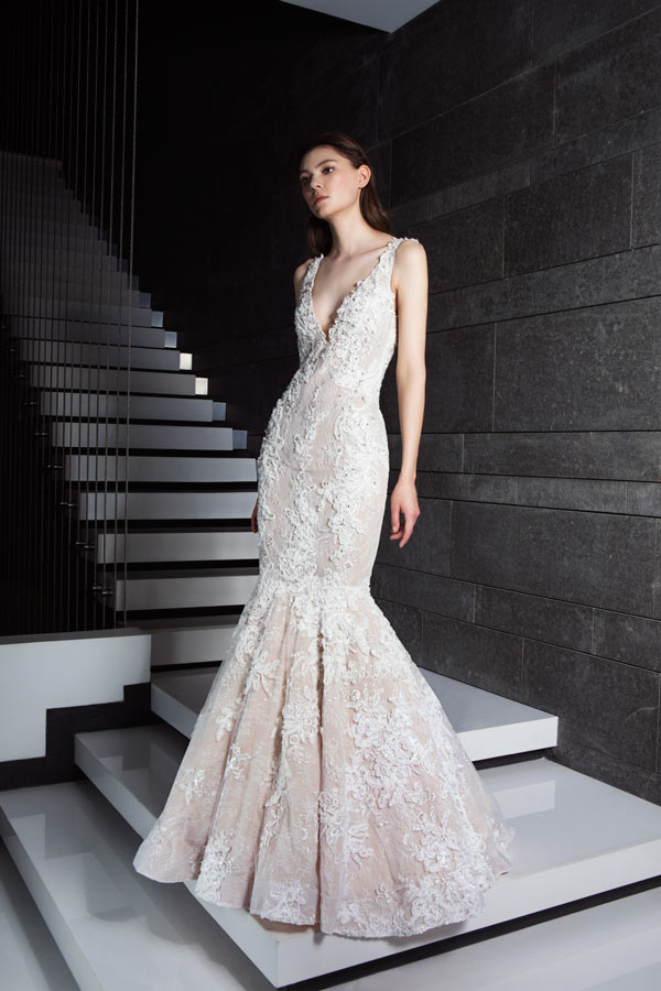 Nella collezione firmata dallo stilista, che ha avuto come maestro Karl Lagerfeld, il pizzo appare sottoforma di ricami floreali che creano un vedo non vedo sensuale tenendo ben nascoste le parti più intime della sposa. Un effetto sobrio, giovanile e di gran lusso, per donne che sanno cosa vogliono e che si ispirano alle grandi dive internazionali.
