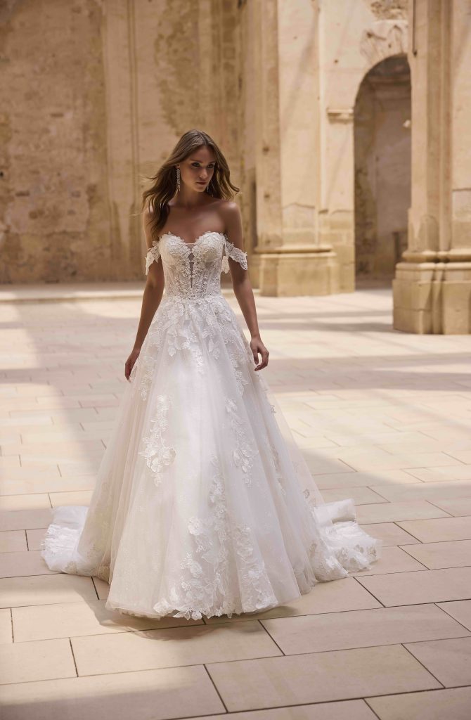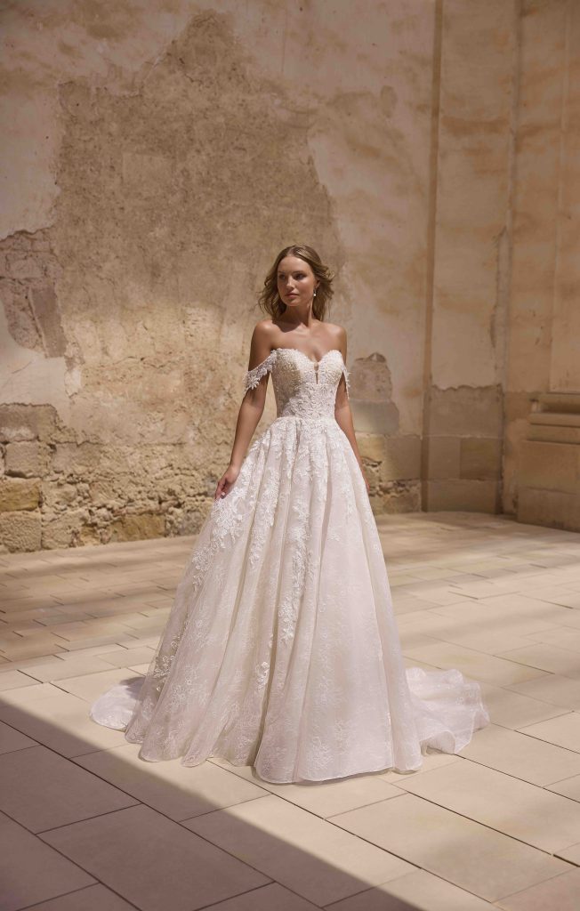 Abiti dalle linee pulite ed, al tempo stesso, ampie, con ricami in pizzo e un vero e proprio richiamo all’haute couture. Ogni abito è una celebrazione della bellezza naturale, della grazia e della fiducia che ogni sposa porta con sé nel giorno più importante della sua vita.