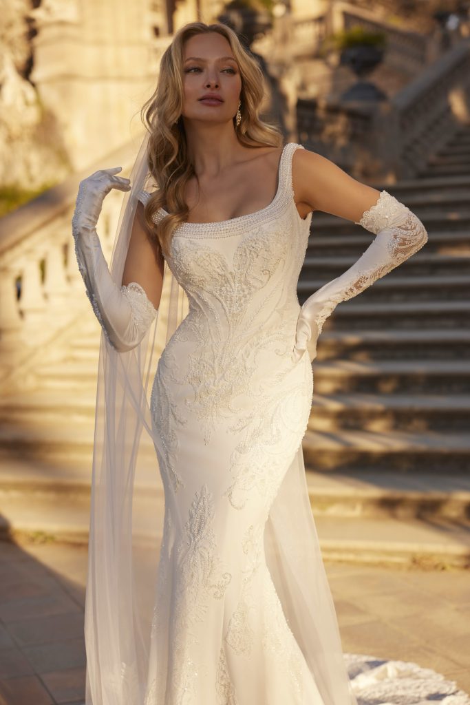 A completare la collezione, una ricca selezione di accessori che aggiungono un tocco di luce e definiscono l’armonia dell’intero look: dai veli ai guanti, dalle cinture alle mantelle fino ai gioielli.