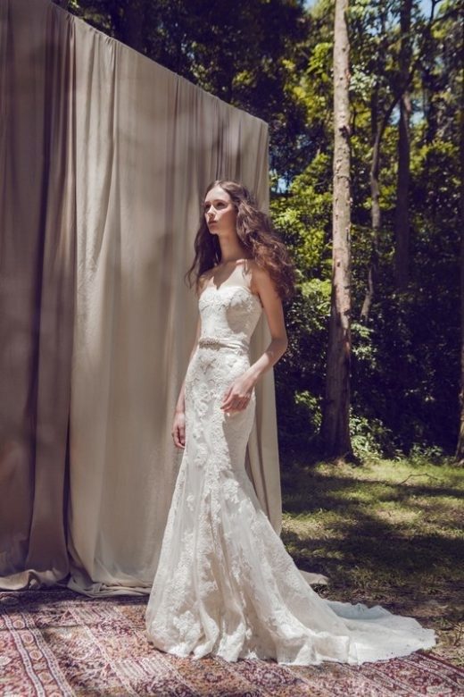 E’ una sposa eterea, quella della Collezione 2017 di Lusan Mandongus (www.lusanmandongus.com). Tessuti morbidissimi e trasparenti svelano gonne fasciate e modelli sinuosi. Ricami di pizzo si arrampicano sui bustini con scollature caste e delicate, ma sempre classiche. Nulla si rivela per la donna dello stilista di Hong Kong, il corpo è celato e le fluide sete rivelano le forme soltanto nei movimenti.