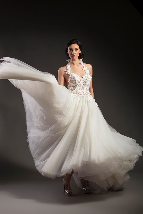 Abiti dalle ampiezze delicate che rimandano a scenari bucolici con i piccoli fiori ricamati o sovrapposti per ricreare ricercati effetti tridimensionali. Le maniche sono a sbuffo trasparenti mentre le linee sono sinuose in questo continuo sensuale gioco di vedo non vedo.