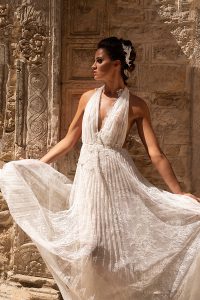 “Per la sposa 2021 ho pensato a strass, micro e macro paillettes, iridescenze, glitter e sfumature delicate. – Spiega la stilista – Allo stesso tempo non mancano però gli spacchi vertiginosi e trasparenze con tessuti impalpabili che vestono le spalle nude e si intrecciano lungo scollature profonde resi più particolari da ramage floreali”.