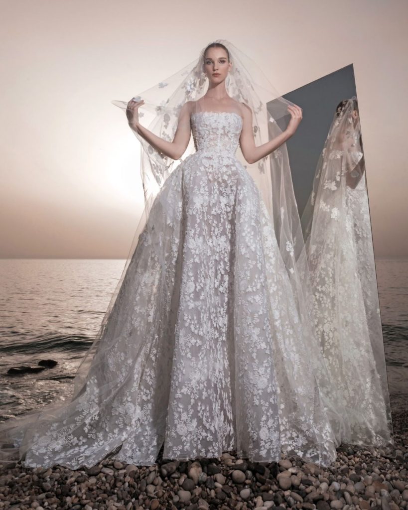 Gli elementi XXL e i volumi maxi, rappresentati da gonne ampie e grandi fiori, mirano a rendere l’abito da sposa indimenticabile, trasformando la sposa in una vera principessa Disney.