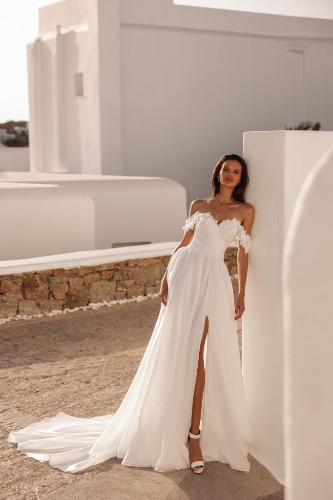 Aderente e modellante, realizzato in seta e decorato con drappeggi sul bustino o lungo la linea delle spalle, o arricchito da un ricamo, ma anche abbinato a un orlo semplice e minimalista: creerà una raffinata architettura, trasformando la sposa in una vera bellezza statuaria.