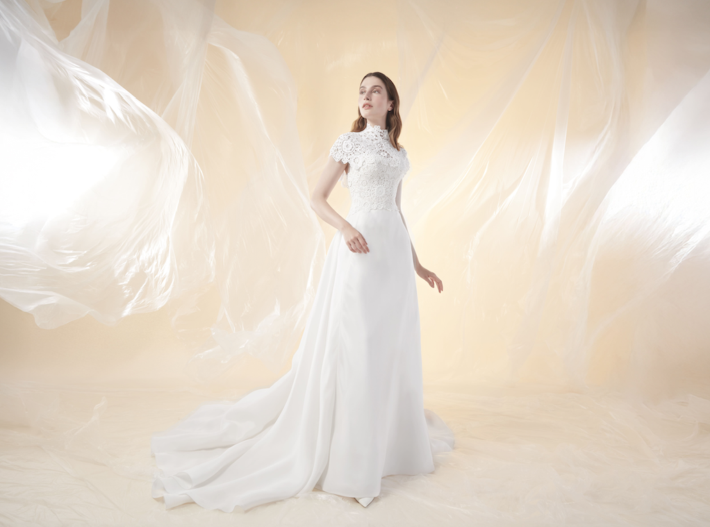 Con il pizzo unico protagonista dell’abito, che si apre all over dal corpetto alla gonna, il concetto di eleganza trova la sua forma espressiva più emblematica e sincera.