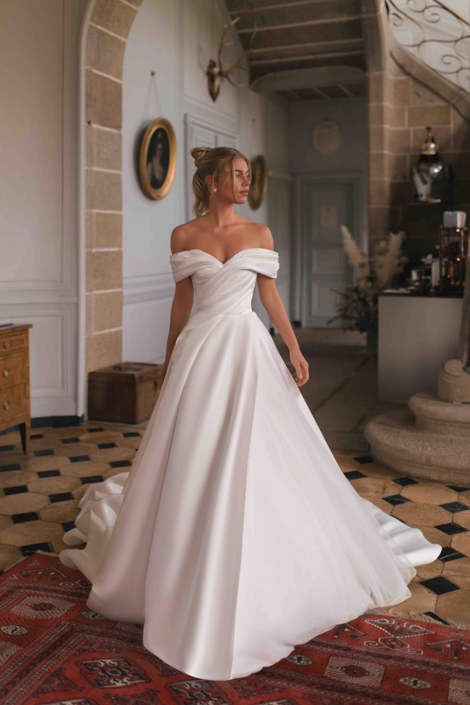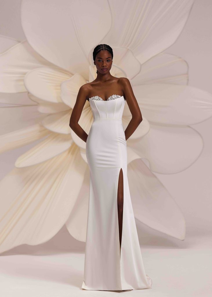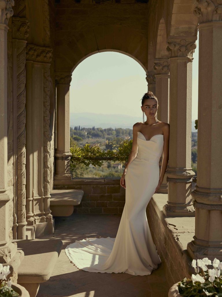Linee pulite e tessuti lisci, come seta, mikado o crepe, mettono in risalto la bellezza naturale della sposa senza ricorrere a dettagli elaborati.