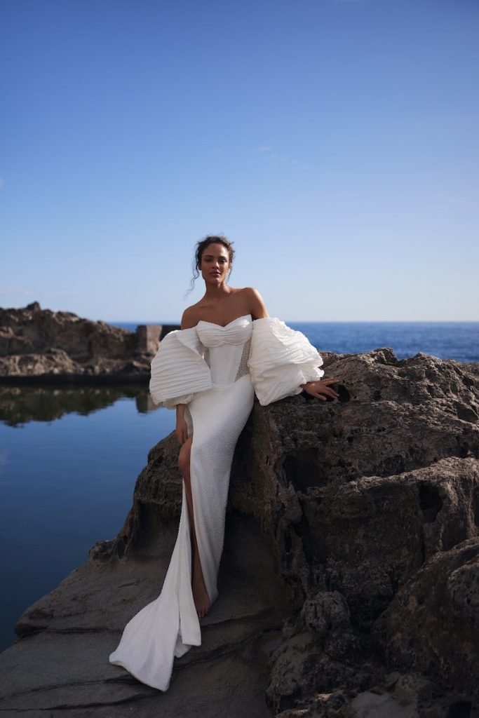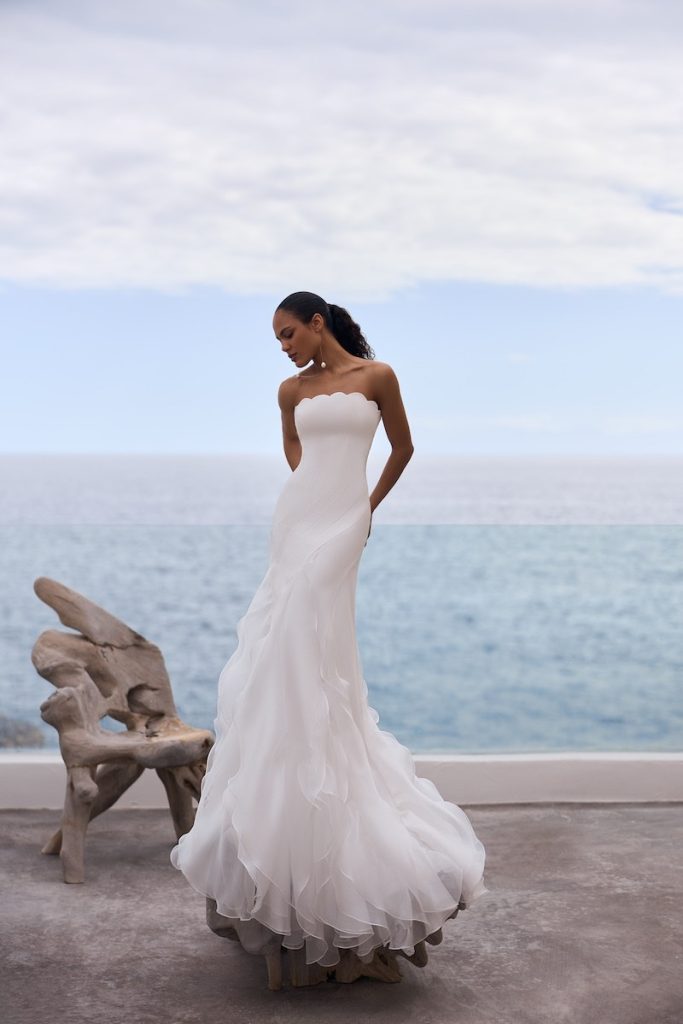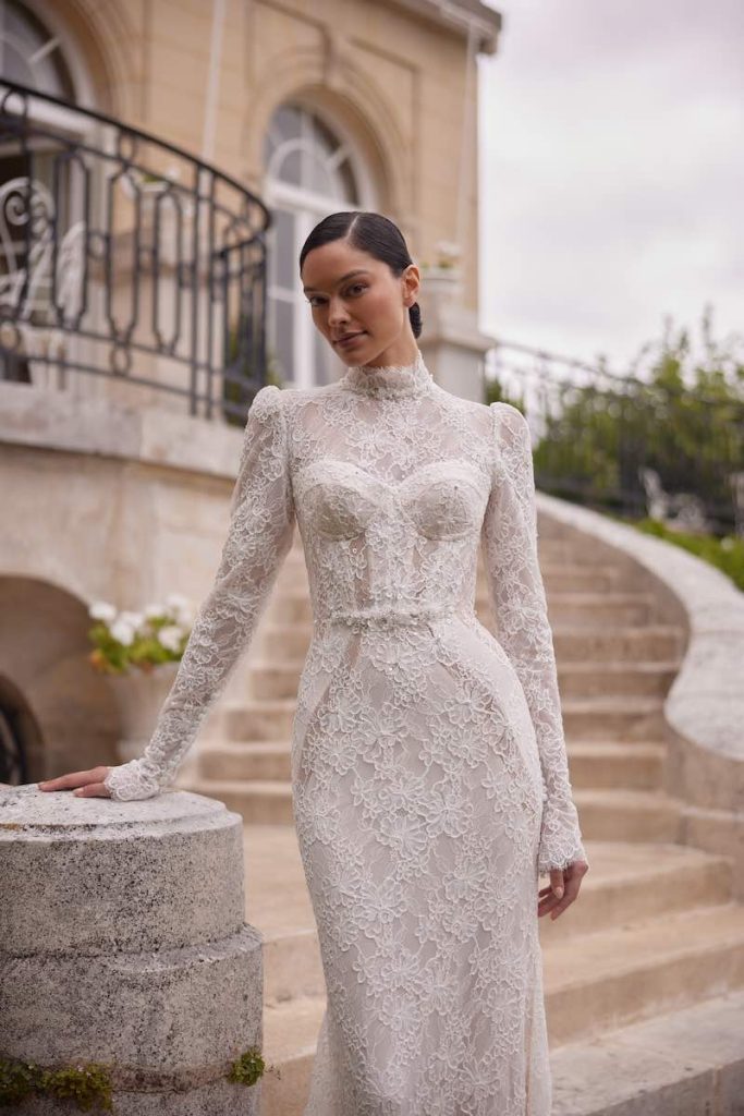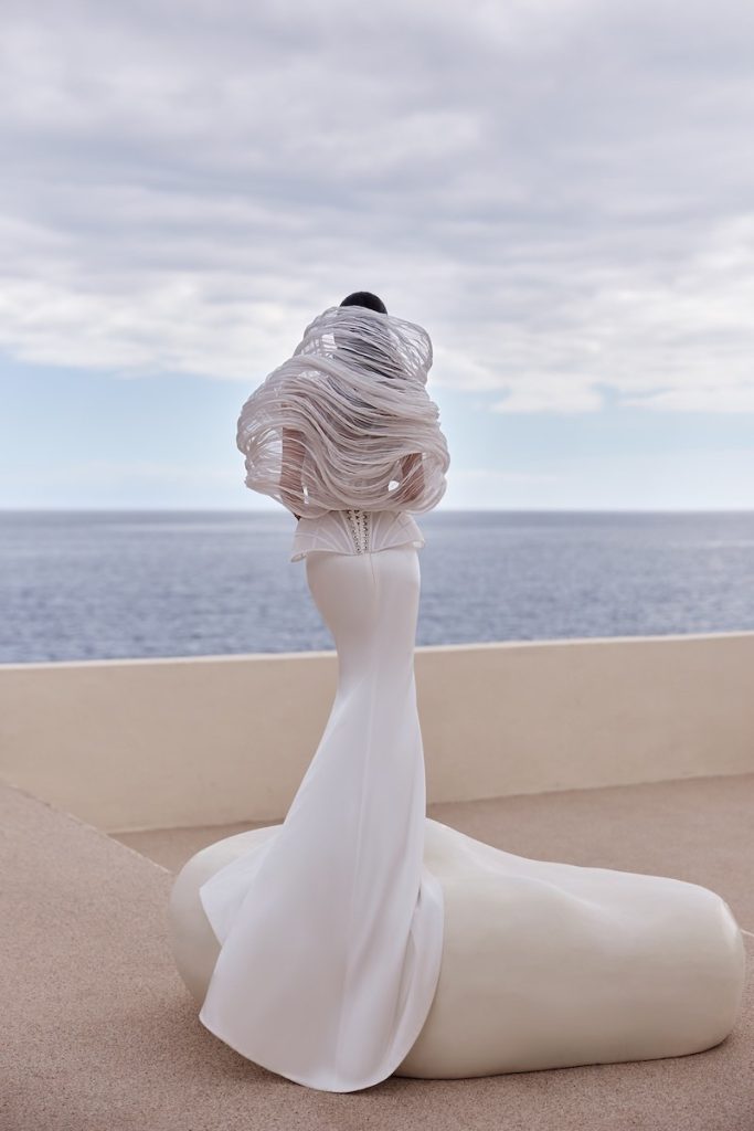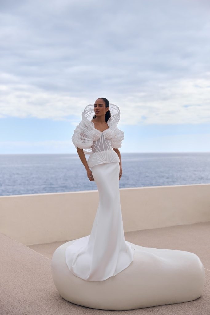 Unisce diverse texture e soluzioni decorative, in cui l’elemento stilistico chiave è la forma corsettata in combinazione con l’organza – un tessuto che mantiene la struttura pur conservando leggerezza.