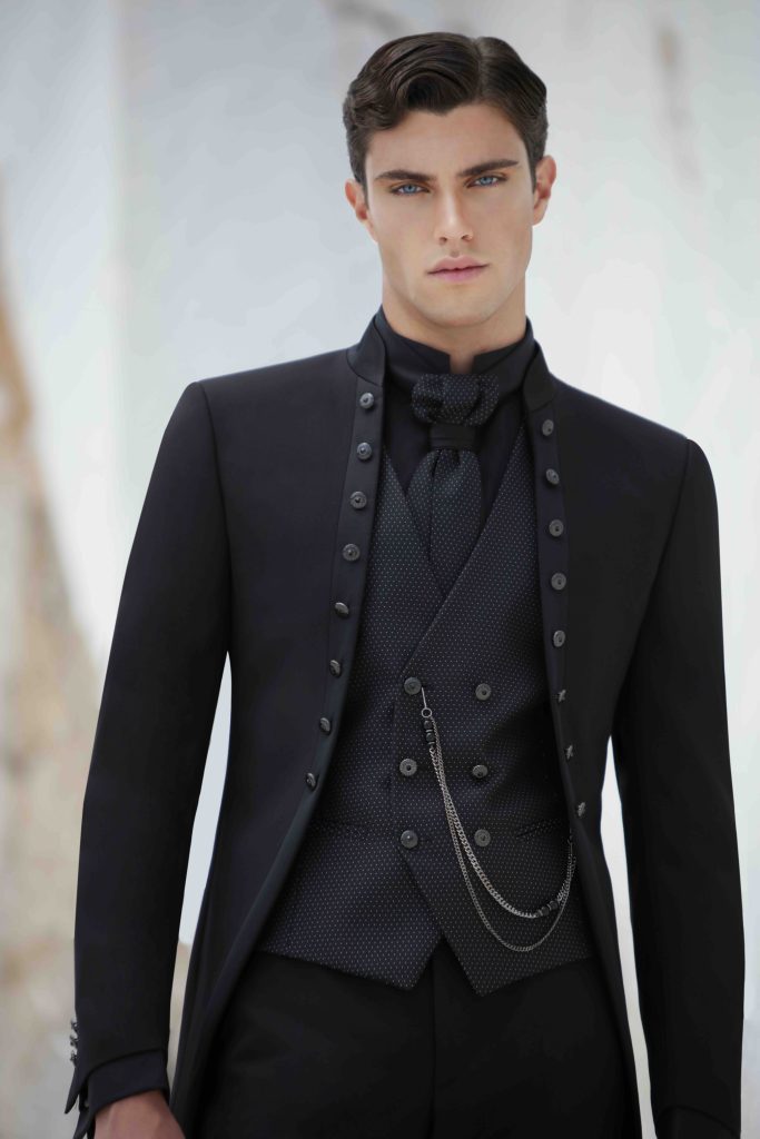 Papillon a contrasto, dettagli in raso, scarpe laccate, cilindri in raso e accessori discreti come catene con pietre preziose, ma anche cinture coordinate e cilindri completano il look, trasformando il total look dello sposo.