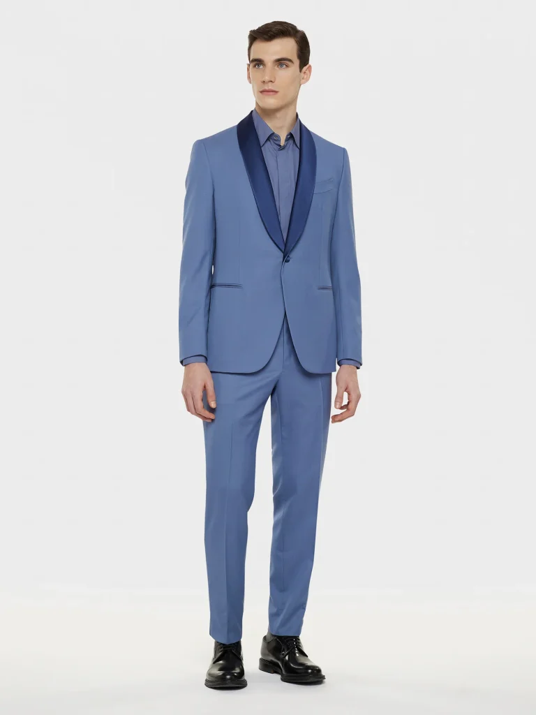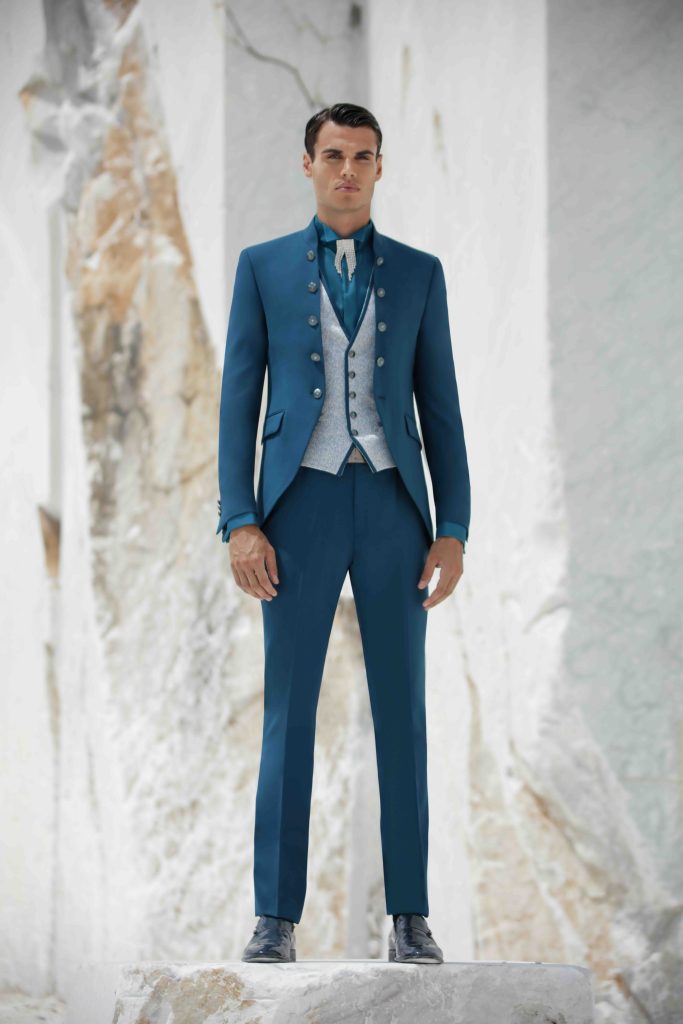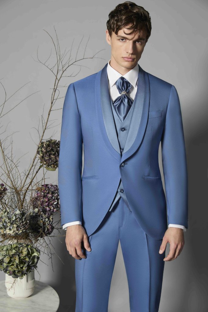 Il blu resta un grande protagonista delle collezioni sposo 2026 e si declina in una palette molto più ampia.