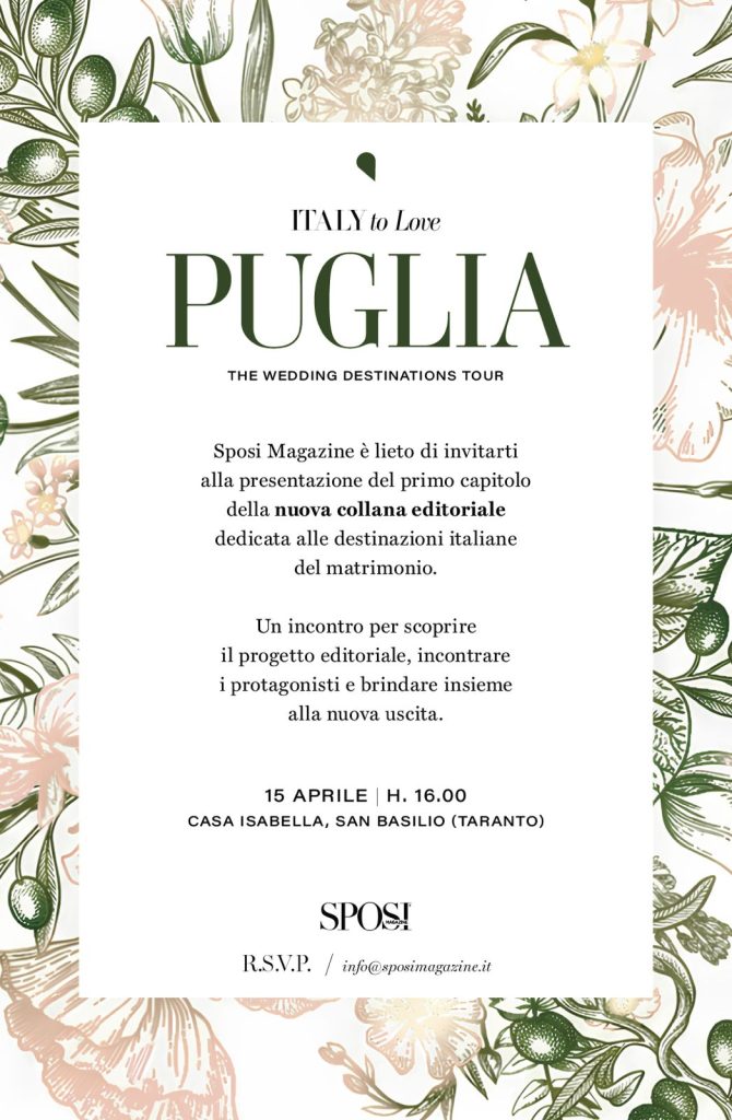 Il fascino senza tempo della Puglia è protagonista del volume di debutto di Italy to Love, la nuova collana editoriale dal nome Sposi Magazine Collections. Un progetto ambizioso e raffinato che prende vita il prossimo 15 aprile a Casa Isabella, dove la direzione di Sposi Magazine presenterà ufficialmente il primo numero, dando il via alla sua distribuzione.