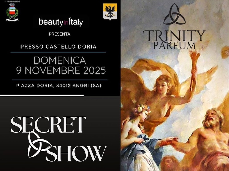 Sabato 9 novembre 2025, dalle ore 16 alle 20, la suggestiva Sala degli Affreschi del Castello Doria di Angri accoglierà il debutto di Trinity Parfum con il Secret Show, un “Evento Olfattivo” che promette di coinvolgere tutti i sensi.