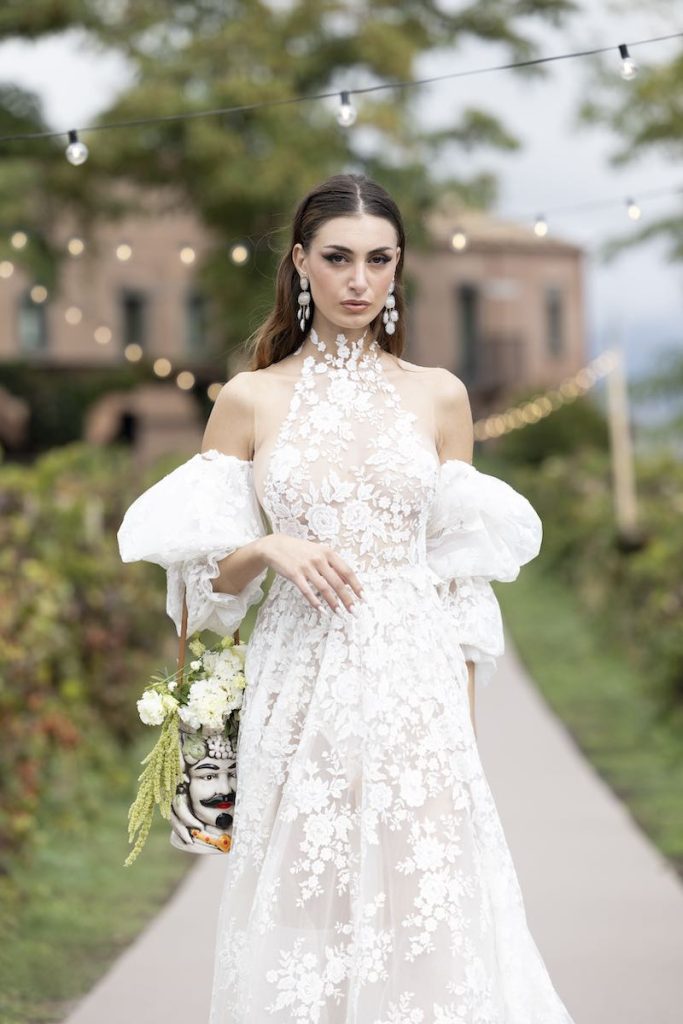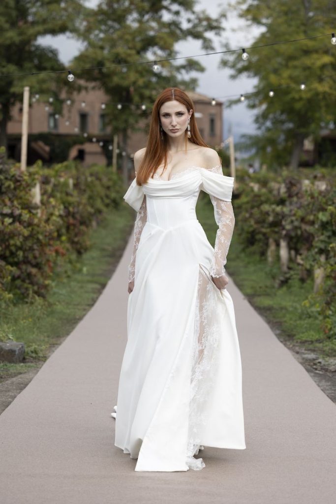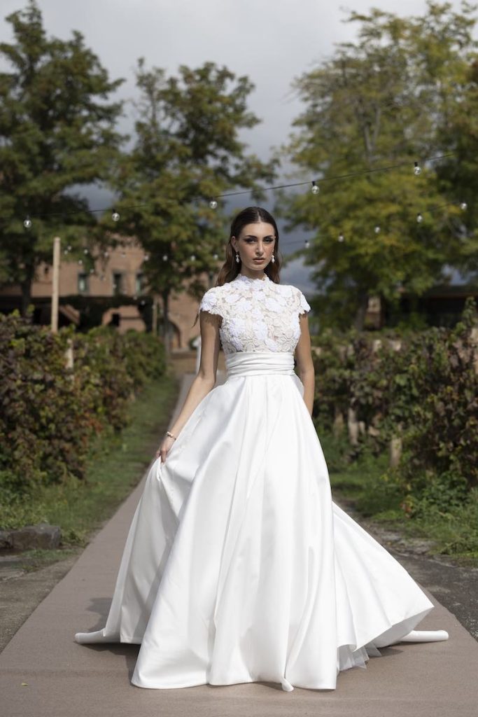A completare la proposta, ricami tridimensionali, fiori scolpiti, trasparenze calibrate e dettagli materici confermano una sposa moderna, consapevole, luminosa.