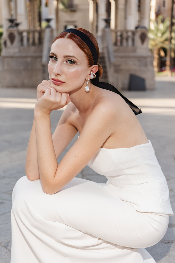 Sul capo, una rete di micro perle che reinterpreta e dona carattere all’hair look da sposa per eccellenza, lo chignon. Un accessorio che trova, poi, il suo continuum perfetto negli orecchini: lunghi, lunghissimi.